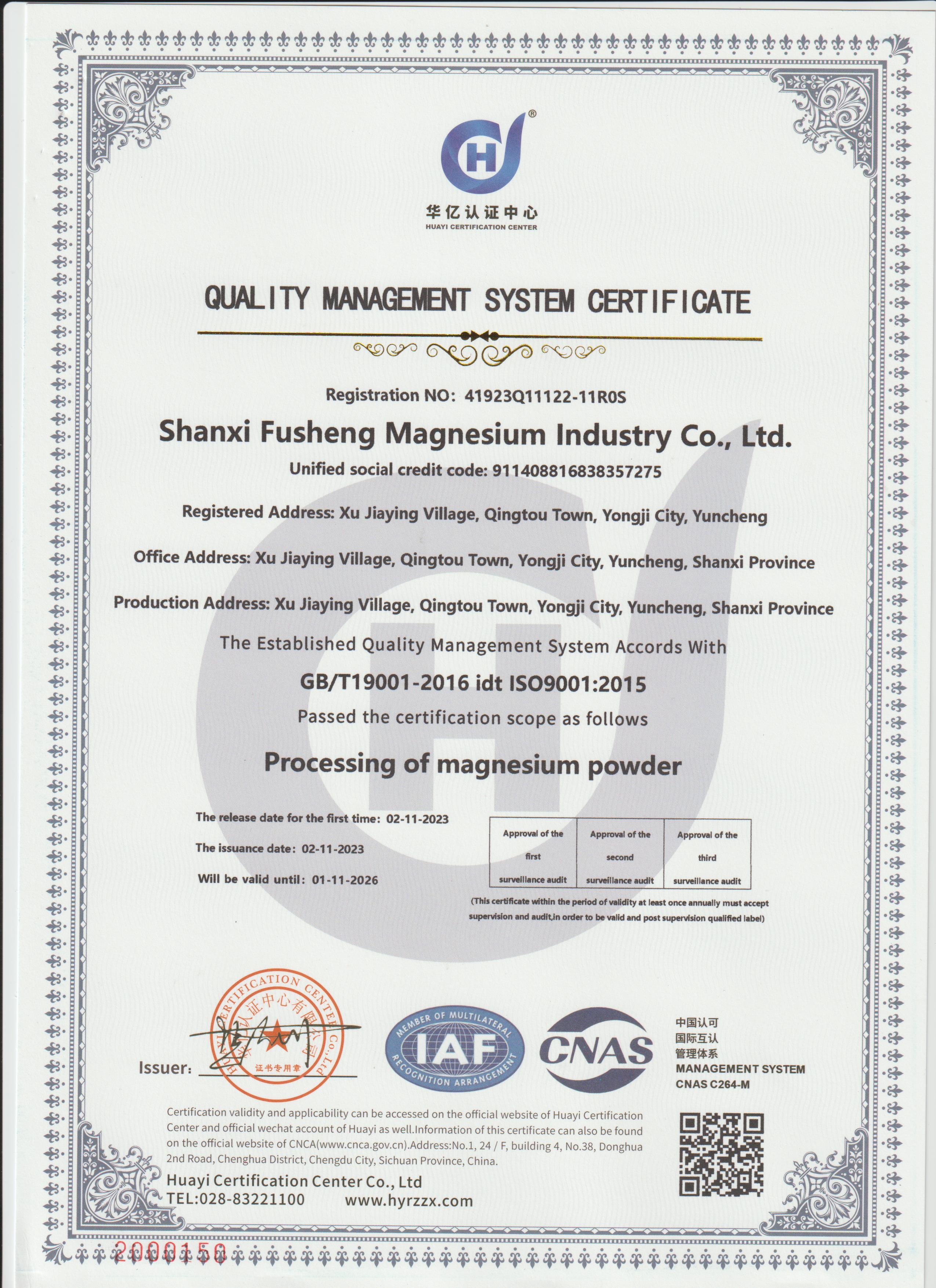 Founded in 2009, our facility spans approximately 20,000 square meters. As a globally leading high-tech enterprise, we have dedicated ourselves to the research, development, and manufacturing of premium magnesium powder since inception. Our product portfolio includes magnesium metal powder, magnesium metal granules, and magnesium metal fragments. As a standardized management enterprise, we hold ISO 9001 certifications for quality, environmental, and occupational health management systems.